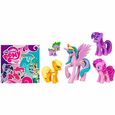Set includes PRINCESS CELESTIA, TWILIGHT SPARKLE, SPIKE THE DRAGON, PINKIE PIE and APPLEJACK figures, crown accessory and a storybook.