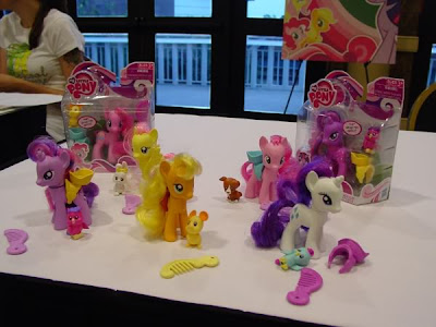 "I got some awesome photos of the prototype ponies with Baby Princess Sparkle for size comparison. These are VERY prototype and they assured me the saddles on the finished models wouldn't leave colored streaks on the sides the way these prototype ones do. Their heads turn, and they're all the same size."