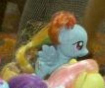 Hasbro appears to have debuted the new G4 Rainbow Dash prototype at BlogHer 2010. Twitter user @caseylikestoeat posted a picture showing the new toy, and enlargement of which is shown below.