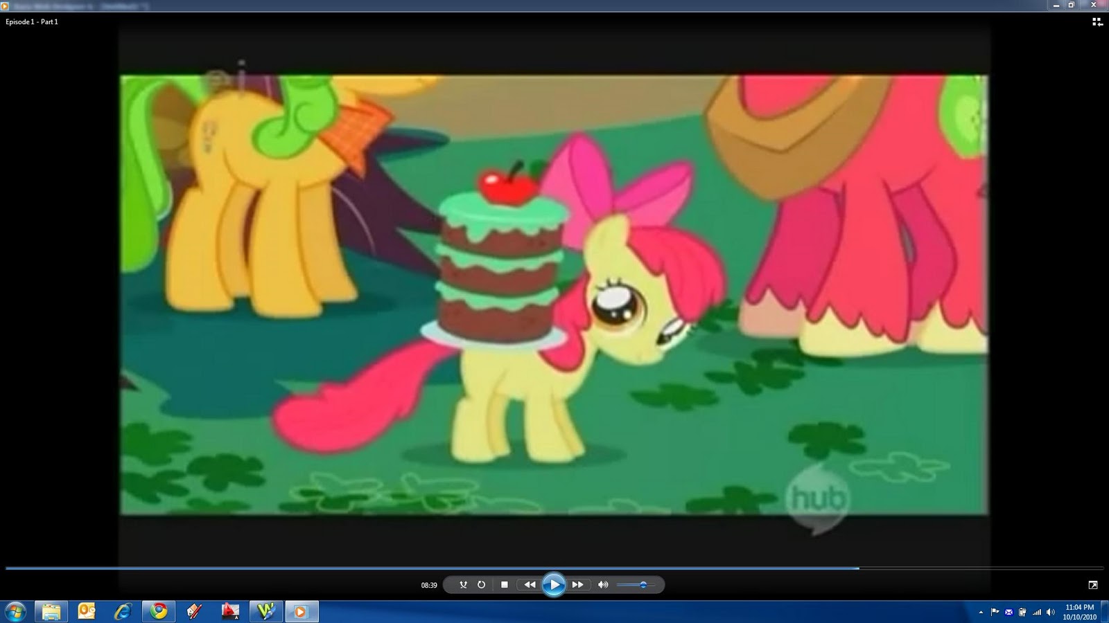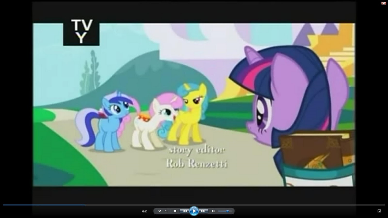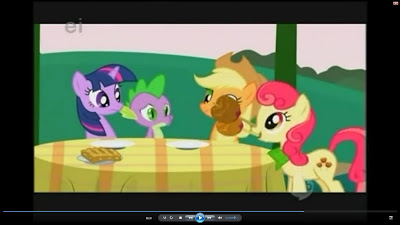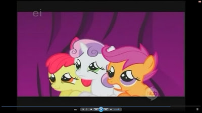 Oh, and if you check the voice cast at the end, Madeline Peters has been credited as 'Scootaloo' (at least I think that's what it says on my fuzzy Youtube copy), so I'm guessing that's the baby pony we see with Apple Bloom and Sweetie-Belle, even though she had no speaking part in this episode. :)