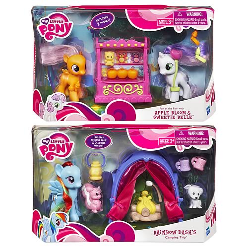 Two new playsets have been listed on Entertainment Earth. One is 'Rainbow Dash's Camping Trip'. The other is listed as 'Fun at the Fair with Apple Bloom and Sweetie Belle,' but the ponies in it appear to be Scootaloo and Sweetie Belle. It's unclear whether the pony pictured, or the name of the playset is incorrect. The playsets are listed as coming May 2011.