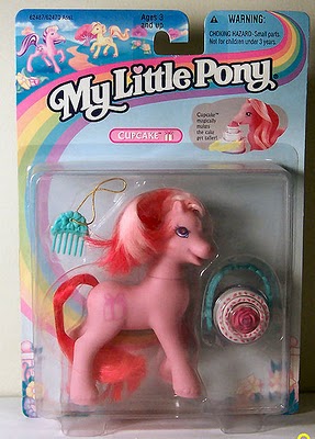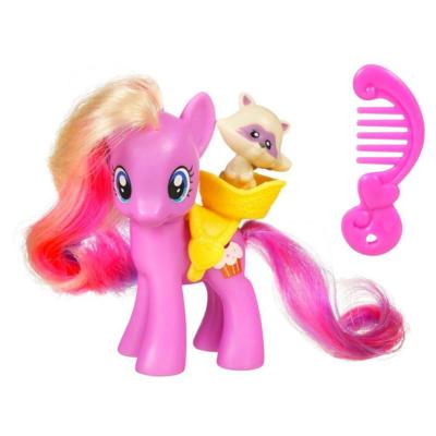 "CUPCAKE is good at just about everything she does. It just takes a little practice, some hard work, and maybe a bit of luck!"Cupcake comes with a pet raccoon. A pony named Cupcake has been included in 3 previous pony generations (G1, G2 and G3), though with different coloring and cutie marks. G4 Cupcake is closest to G3 Cupcake.