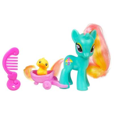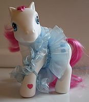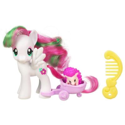 "BLOSSOMFORTH loves the sunshine! It's her job to push the clouds out of the sky whenever they hide the sun for too long."She comes with a pet hedgehog. Blossomforth was also released as part of the G3 line, with different hair and cutie mark colors.