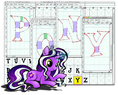 Purple Tinker developed a font based on G4 pony packaging and art: Celestia Medium. Equestria Daily reported, and an anonymous commenter pointed out that the actual font being used is Generation B by Harold's Fonts.