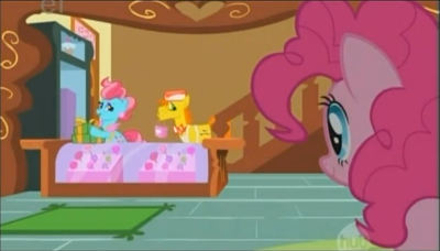 | Screenshot of Mr. and Mrs. Cake with Pinkie Pie from Season 1, Episode 4, "Applebuck Season" |