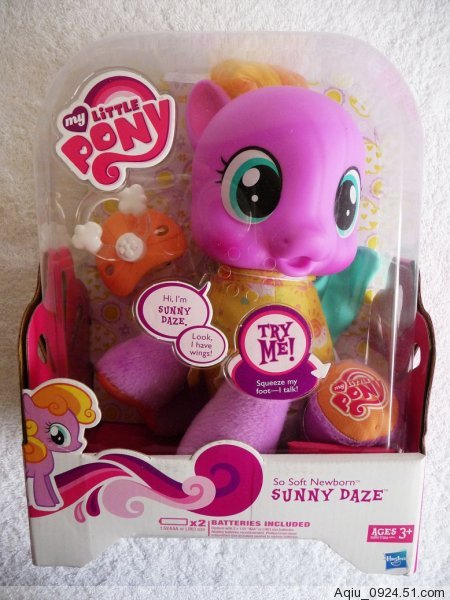 Packaging for the ponies featured at the 2011 Toy Fair (see also) has been leaked from China on taobao.com, according to Sanadaookami at the MLP Arena. Of particular note is the identity of the purple So Soft Newborn: Sunny Daze. This is another case of Hasbro applying a G3 pony name to a very different G4 pony.