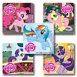 Friendship is Magic stickers are now available from SmileMakers. They come in boxes or rolls of 75 stickers, with each box or roll starting at $5.99. The 2.5" square stickers come in an assortment of 5 designs (sorry Applejack fans).