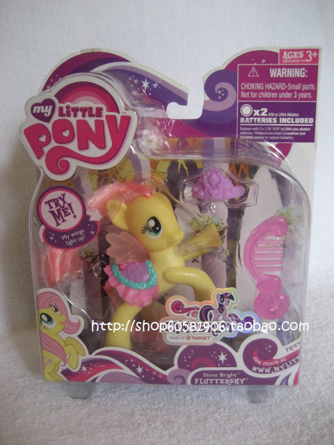 Shine Bright Fluttershy has been spotted at Taobao.com. Like the Celebration at Canterlot Castle Playset, the box has a sticker saying "Canterlot Only at Target", indicating that she will be a Target exclusive. Her release date is unknown. Other Shine Bright Ponies are Rainbow Dash, Pinkie Pie and Rarity, as well as the Twilight Sparkle toy which will be released in the Celebration at Canterlot Castle playset.