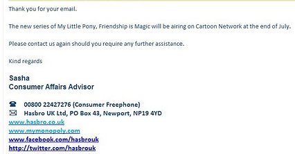 Equestria Daily reports that Cartoon Network in the UK will be airing My Little Pony: Friendship is Magic at the end of July. The information comes via e-mail from Hasbro UK Consumer Affairs.