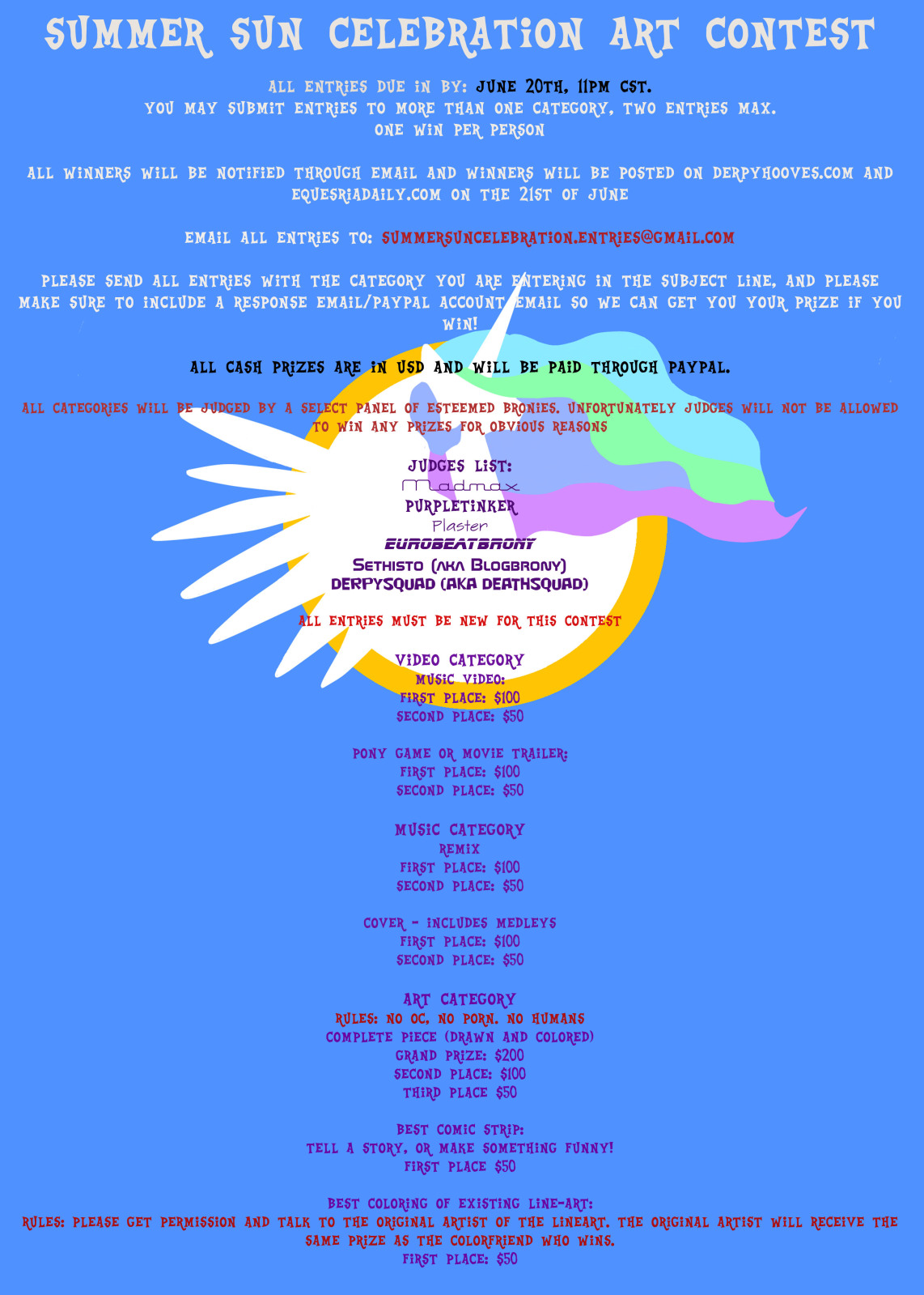 Plaster The Returner is hosting a huge My Little Pony: Friendship is Magic Art Contest, with cash prizes. From Equestria Daily: