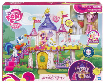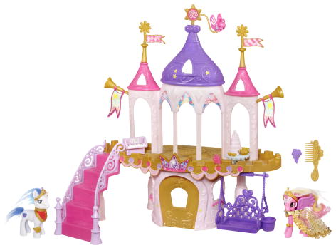 Some images have surfaced of the aforementioned wedding castle. It includes Princess Cadence and Shining Armor figures. Shining Armor is the first brushable stallion of G4!