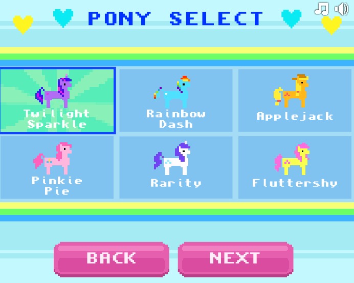 You start the game as Twilight Sparkle and traverse through six levels filled with dangerous spikes and fire-breathing dragons. All of the Mane 6 are available to play as, but you must first unlock each successive pony by completing all six levels as the previous pony. I haven't played much of it yet, but it's a cute game with a charming old school feel. If you have time you should definitely give it a whirl!