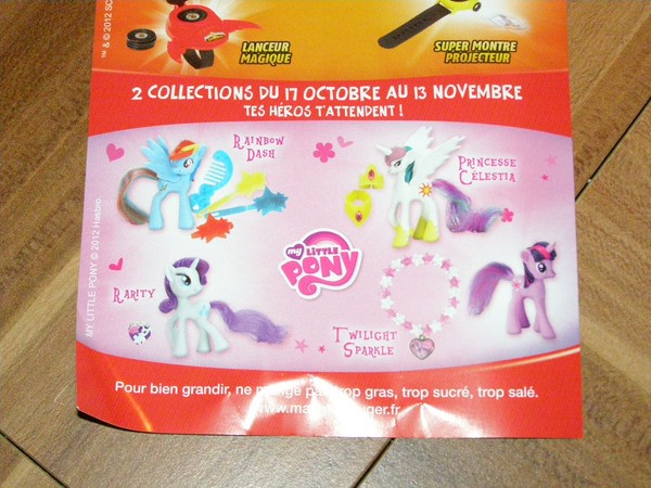 My Little Pony prizes are available at the French restaurant Quick Fastfood from now until November 13. Available are Rainbow Dash, Princess Celestia, Rarity, and Twilight Sparkle.