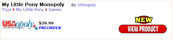 This product was recently listed on Big Bad Toy Store. It is simply called "My Little Pony Monopoly" and currently does not have a photo. It is up for pre-order for $39.99 and is estimated to arrive in July of this year.