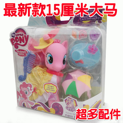 Fashion Style Pinkie Pie is getting another re-release, this time with brand new accessories! She comes with a hat you can decorate with plastic gems, along with an umbrella hat, ice cream hat, and yellow dress. Lots of hats! She also has "crystal eyes" like other ponies in the Crystal Empire line.