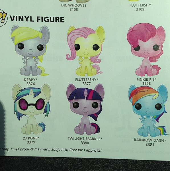 This is artwork from the Funko catalogue. Looks like the six ponies being released are Derpy Hooves/Ditzy Doo (called Derpy), Fluttershy, Pinkie Pie, DJ P0N-3, Twilight Sparkle, and Rainbow Dash. Photos of the physical toys have not been seen yet, but should surface soon.