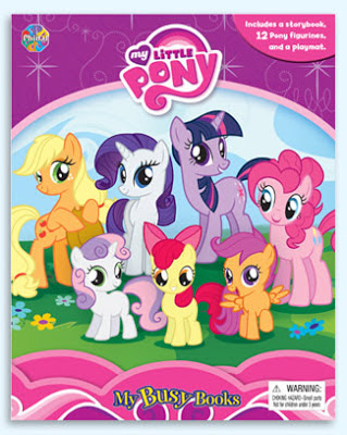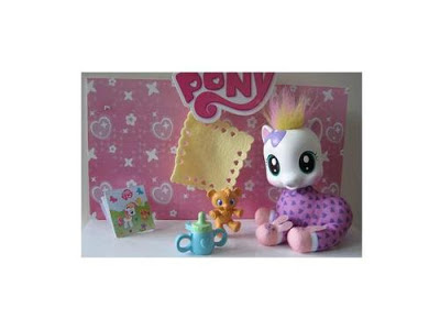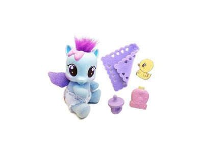 A pegasus pony, possibly Rainbow Dash. Comes with blanket, pacifier, toy duck, and something else I can't quite make out.