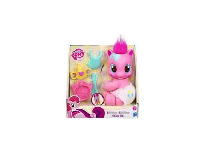 White earth pony with pink and yellow mane. Comes with a blanket, bottle, and toy bear.